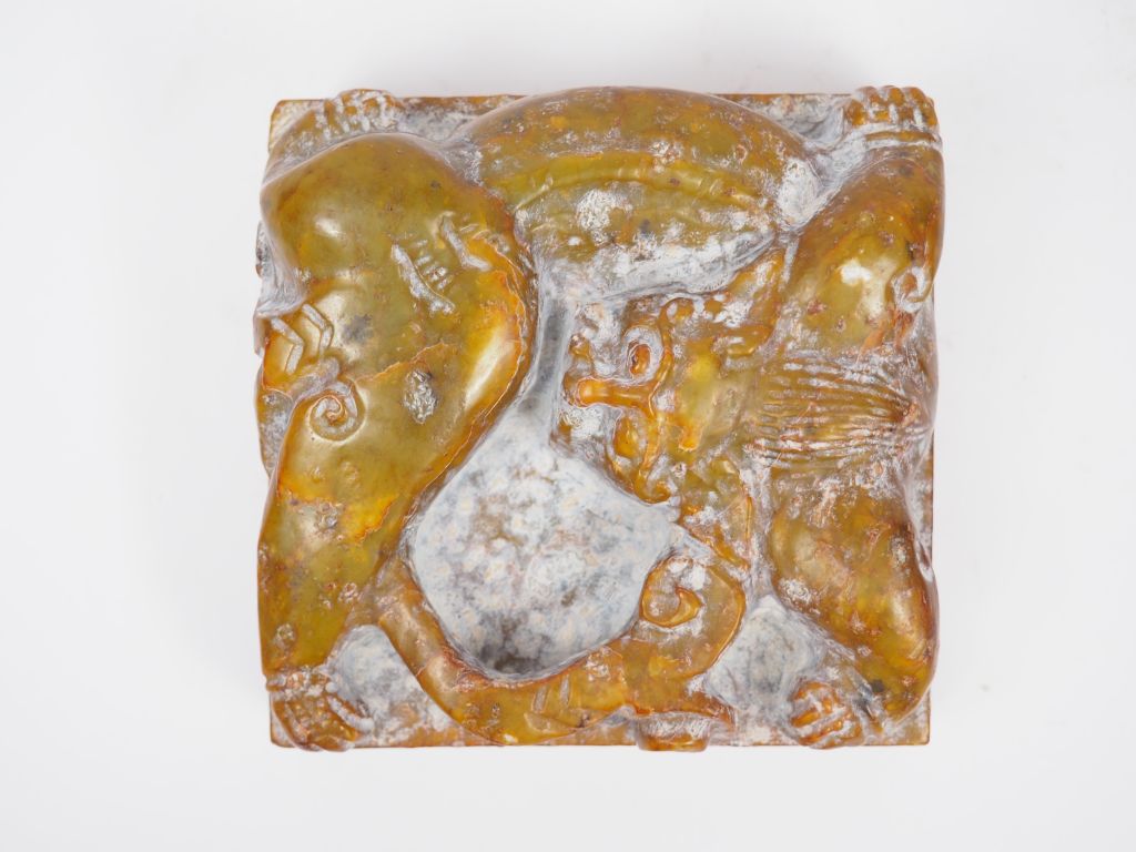 Sceau en serpentine, à décor d'un dragon lové et de masques de Taotie. Chine, XXème siècle. 9,5 x 9,5 cm