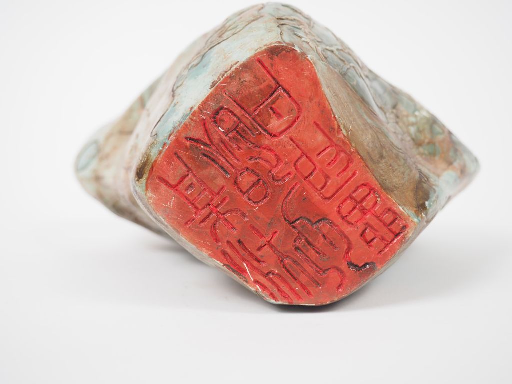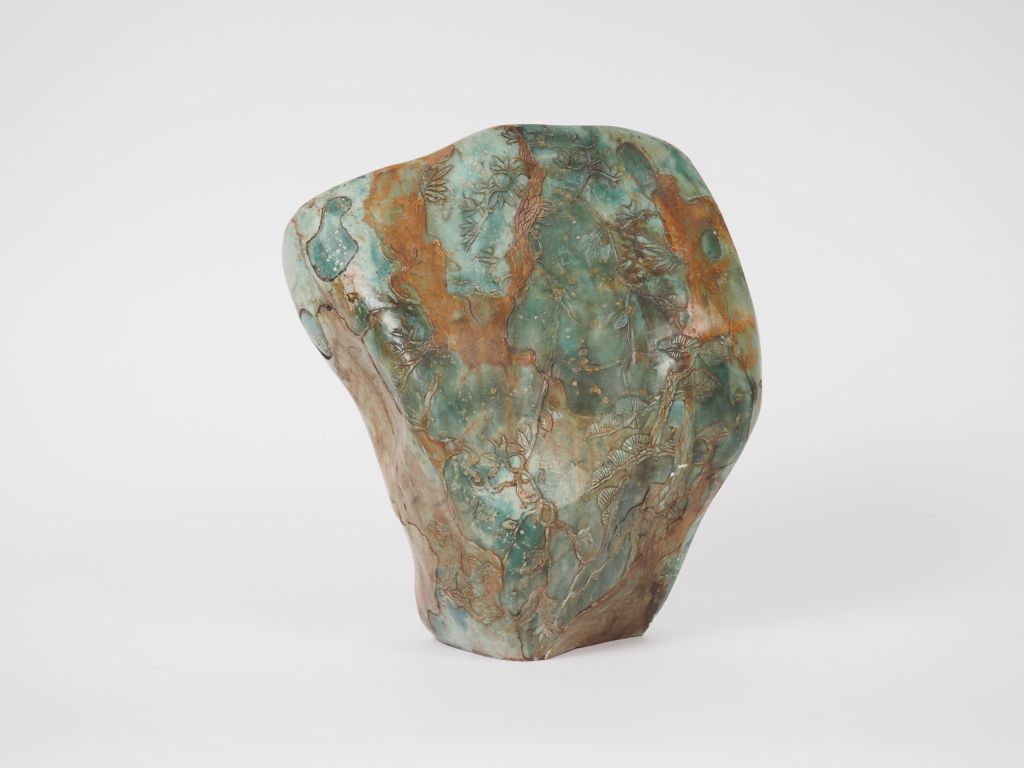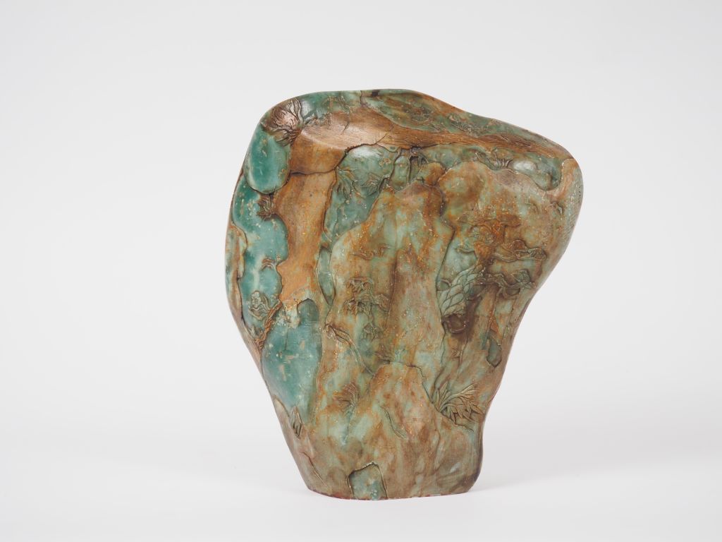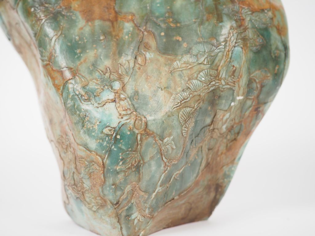 Sceau en stéatite verte reprenant la forme d'une montagne arborée de pins de longévité. Chine, XXème siècle. H. 22,5 cm.