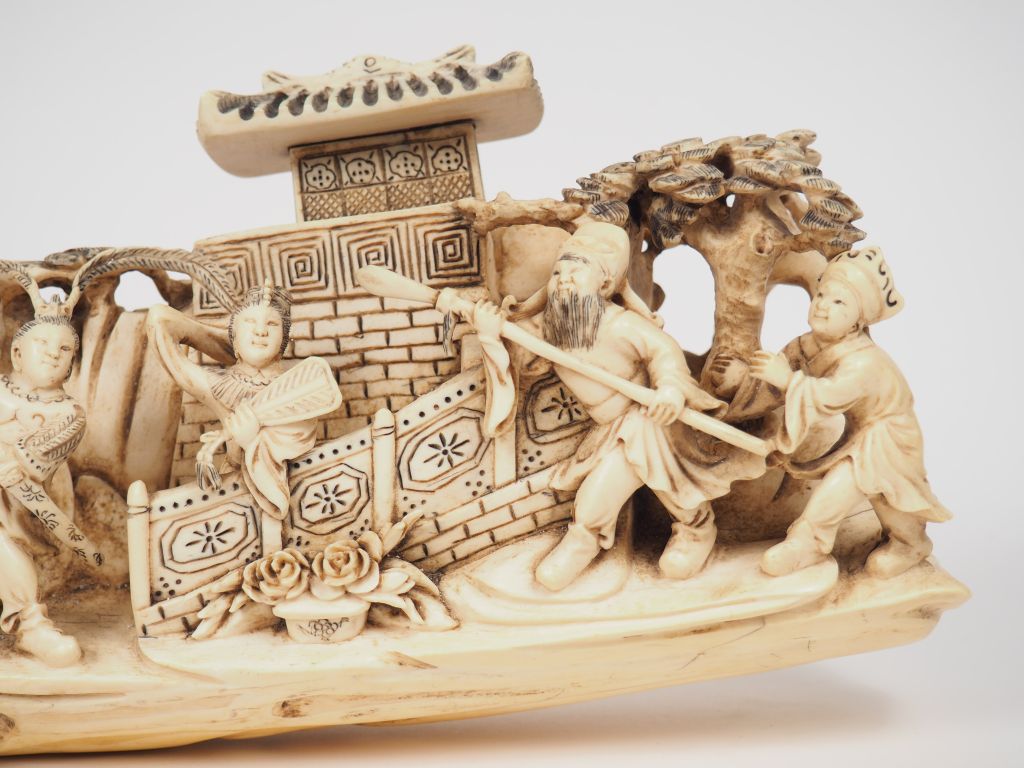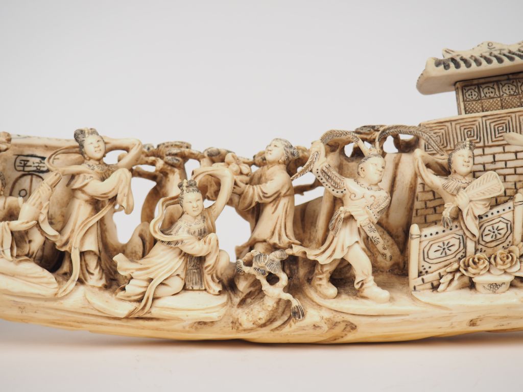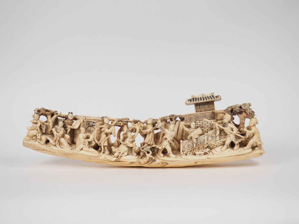 Sculpture sur ivoire représentant une scène de théatre se déroulant dans un jardin. Chine vers 1930. Long. 48 cm Poids : 2900 g Nom scientifique de l’ivoire : ivoire d’éléphant Elephantidae spp (I/A, pré-convention), spécimen antérieur au 1er juin 1947 et conforme à la réglementation CE 338/97 du 09/12/1996, art. 2-W mc. Pour une sortie de L’UE, un CITES de ré-export sera nécessaire, celui-ci étant à la charge de l’acquéreur.
