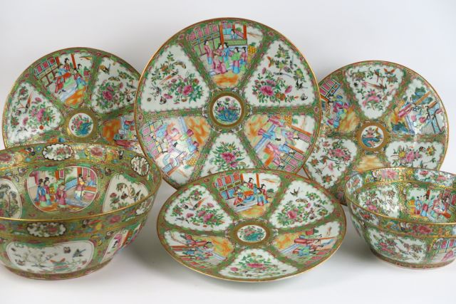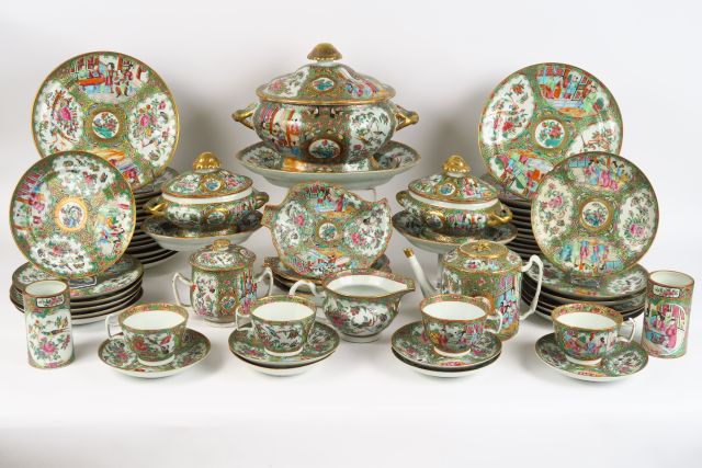Service de table XIXème en porcelaine polychrome de Canton à décor dans des réserves de personnages de cour, de fleurs et d'insectes comprenant : 82 pièces
