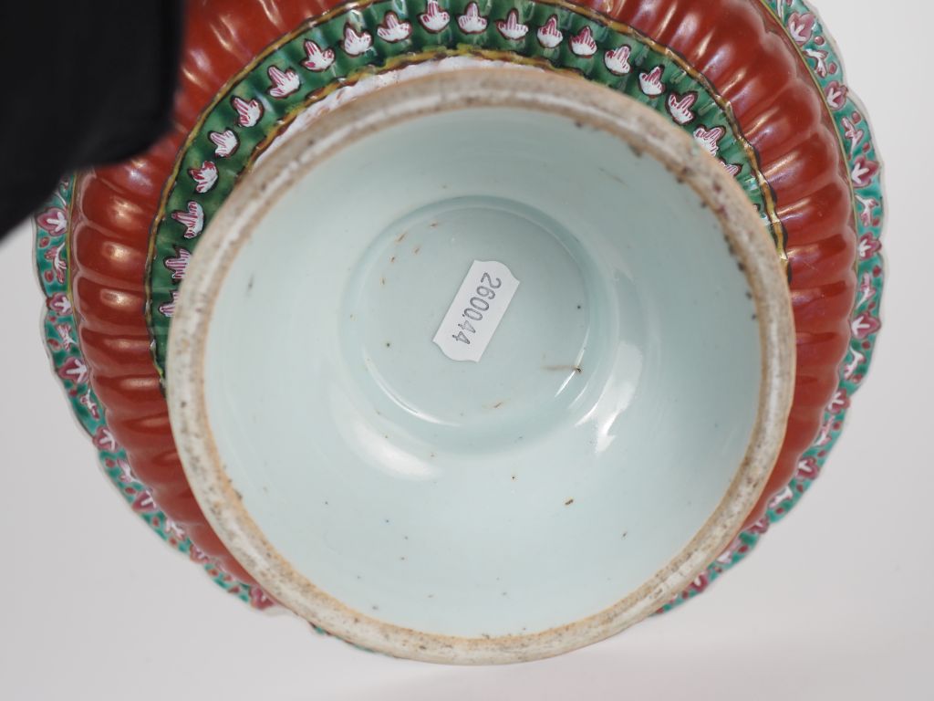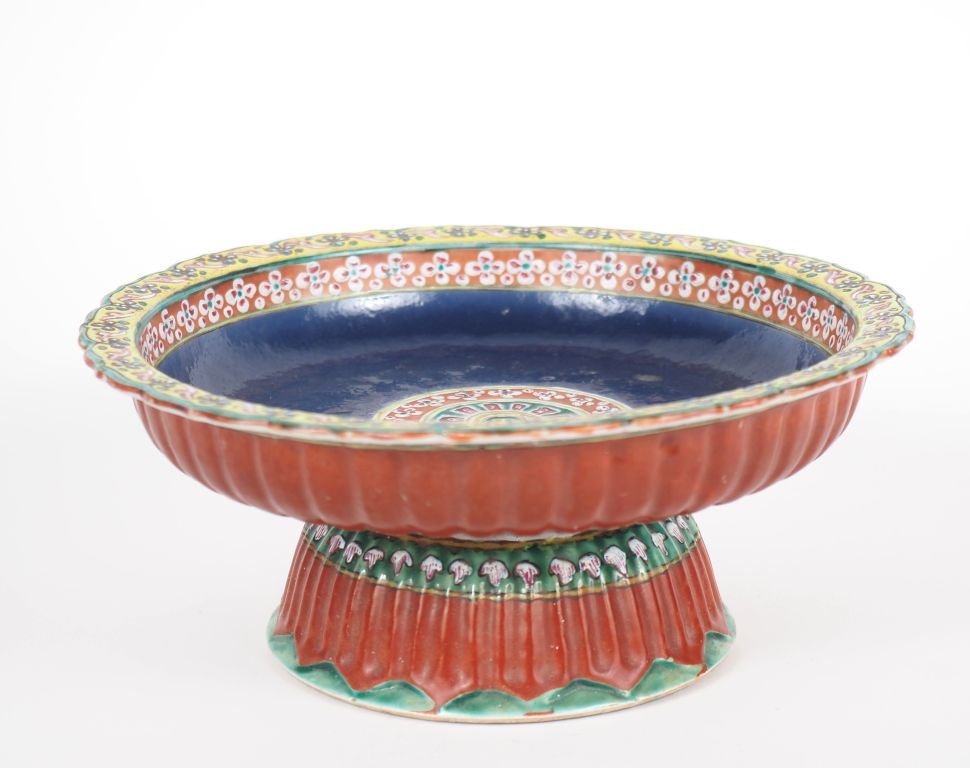 Siam, XIXe siècle Grande coupe floriforme sur piédouche en porcelaine de Bencharong, à décor en émaux polychromes de fleurettes, rinceaux feuillagés. Le revers reprenant la forme de pétales et godrons en léger relief émaillés corail. Diam. 22 cm – H. 10 cm