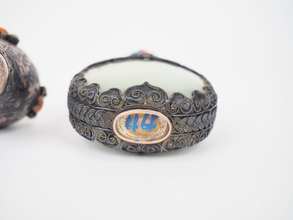 Sino-Tibet fin XIXème. 2 flacons tabatières, l'un en jade céladon gainé de motifs de fleurs et de rinceaux feuillagés et surmonté de cabochons de turquoise et corail L'autre en argent bas titre à décor ciselé de motifs de rinceaux feuillagés et orné de cabochons de turquoise et corail. H. 8 cm.