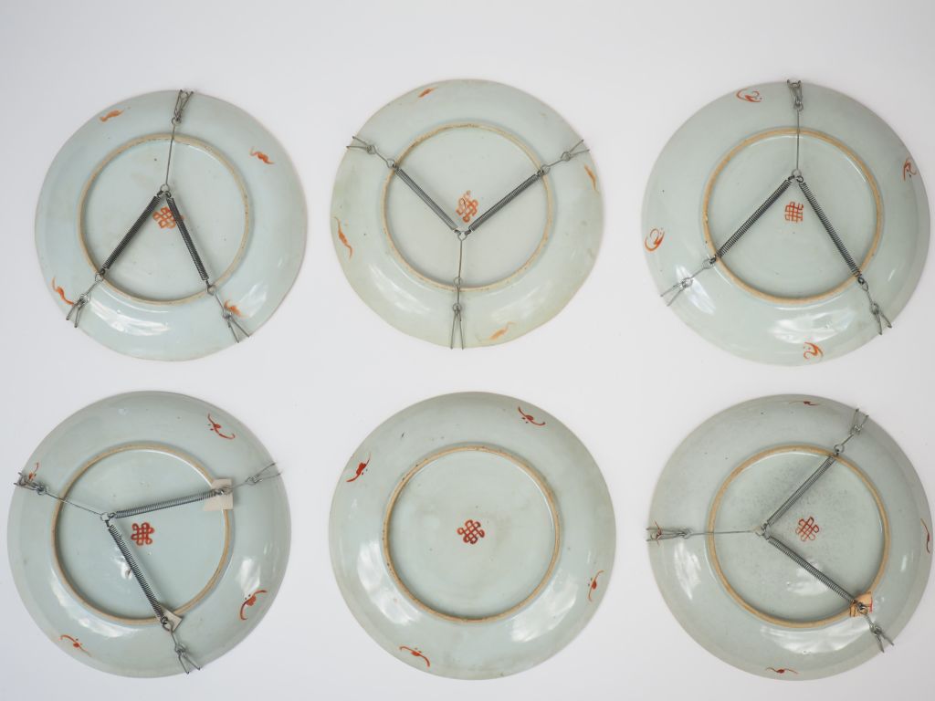 Six assiettes en porcelaine et émaux de la famille rose, à décor divers de lotus, cerisiers en fleurs, papillons, pivoines, prunus, pêche de longévité etc … Chine, vers 1880. Diam. 24,5 cm et 23 cm