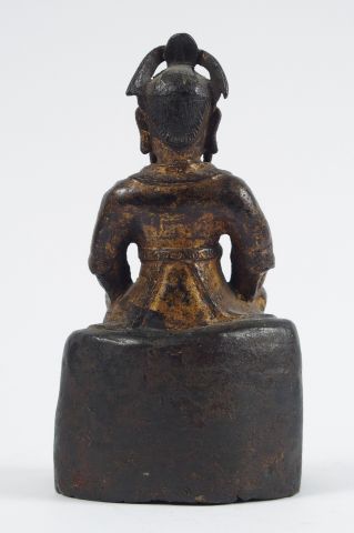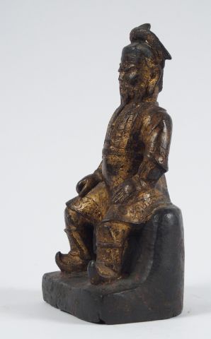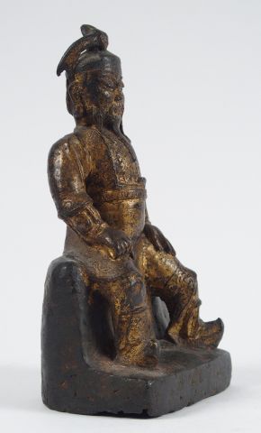 Statuette en bronze laqué et doré représentant Guandi en armure, assis sur un rocher. Chine XVIIème siècle, période Ming. H. : 22 cm