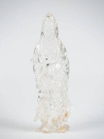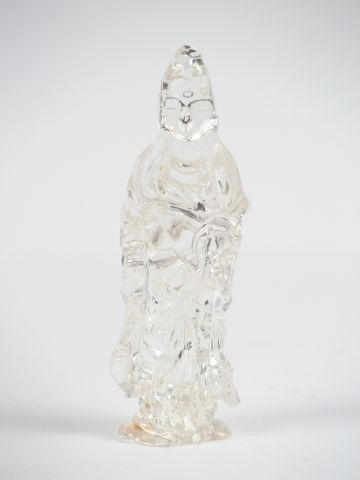 Statuette en cristal de roche représentant une divinité tenant le joyaux sacré. Chine XXème siècle. H. : 16,5 cm