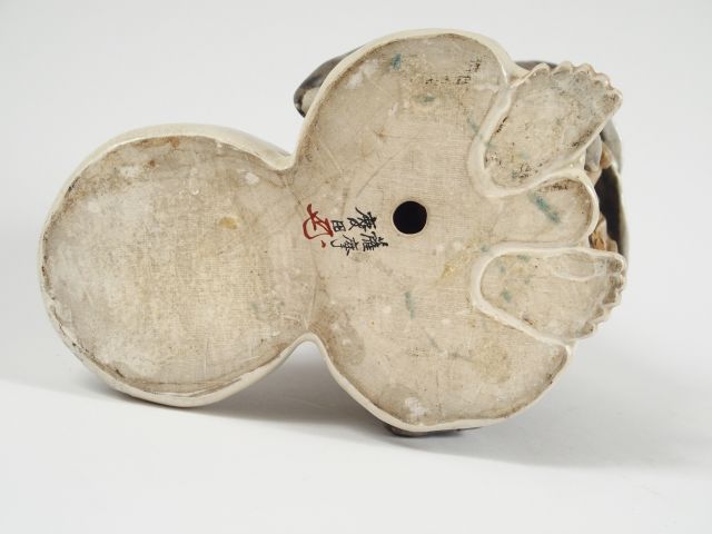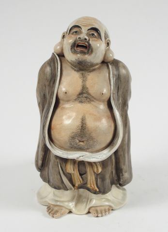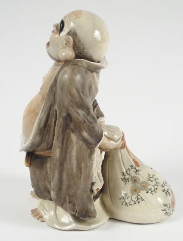 Statuette en faïence de statzuma représentant Ohteï debout tenant dans son dos le sac des richesses. Japon, période Meiji. H. : 25,5 cm (fels de cuisson)