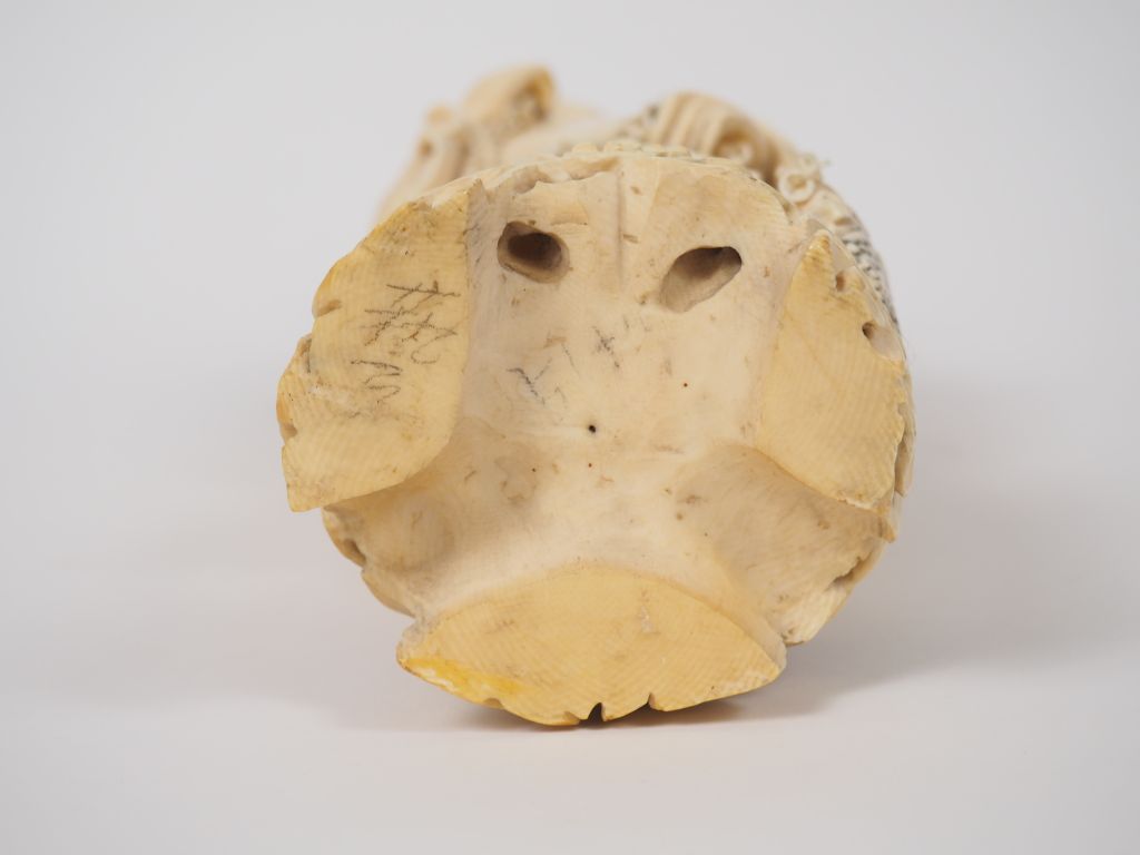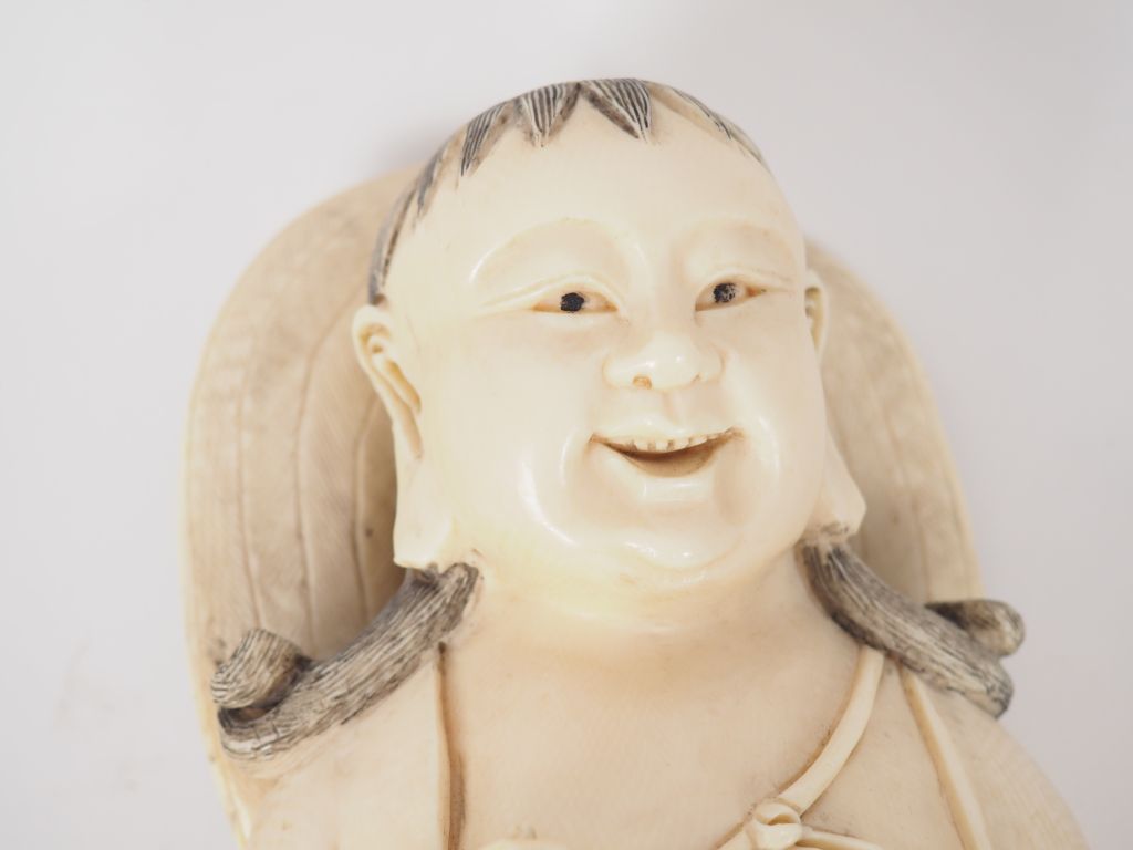 Statuette en ivoire finement sculpté représentant Liu Hai accompagné du crapaud céleste debout sur des nuages stylisés. Chine, vers 1930. H. 34,5 cm Poids. 2202 g (petit manque à une chaine) Nom scientifique de l’ivoire : ivoire d’éléphant Elephantidae spp (I/A, pré-convention), spécimen antérieur au 1er juin 1947 et conforme à la réglementation CE 338/97 du 09/12/1996, art. 2-W mc. Pour une sortie de L’UE, un CITES de ré-export sera nécessaire, celui-ci étant à la charge de l’acquéreur.