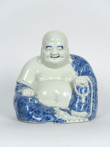Statuette en porcelaine bleu blanc, représentant le Bouddha Milefo assis sur le sac des richesses et tenant le rosaire. Chine, vers 1920. H. 32,5 cm