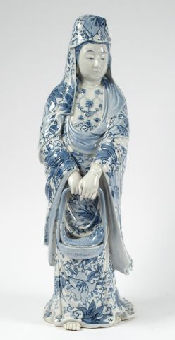 Statuette en porcelaine d'Aarita représentant une divinité tenant un panier contenant un poisson. Japon vers 1900-1920. H. : 46 cm