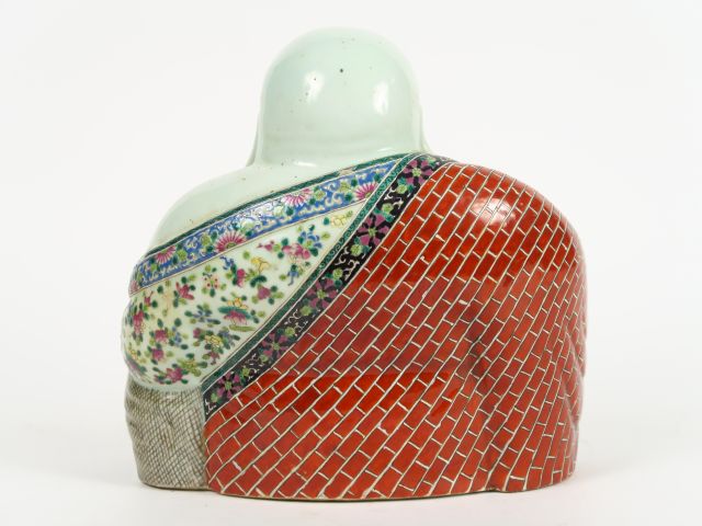 Statuette en porcelaine et émaux de la famille rose représentant Bouddha Milefo assis sur le sac des richesses. Chine, vers 1900 H. 28 cm