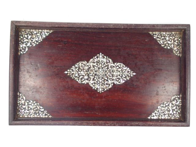 Suite de 5 plateaux gigognes en marqueterie de nacre et bois exotique à décor de feuillage. Indochine
