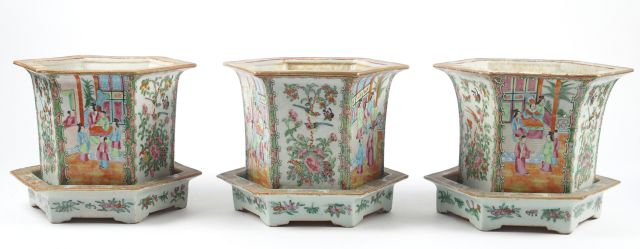 Suite de trois jardinières et leurs présentoirs XIXème en porcelaine polychrome de Canton, à décor de scènes de personnages et de composition florale. Période Guan Xu