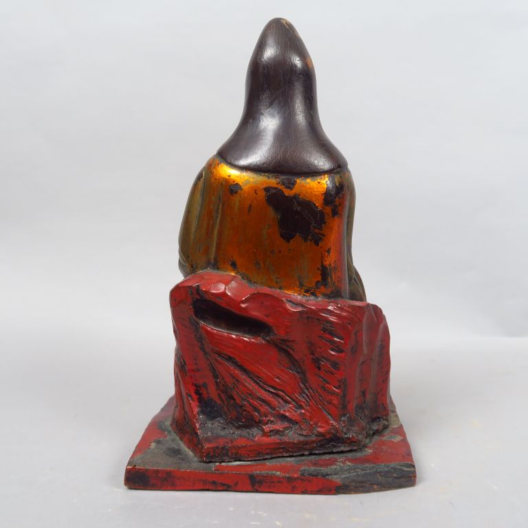Sujet en bois laqué or et rouge représentant Guanyin assise tenant le rouleau. Indochine, fin XIXe siècle. H. 25 cm