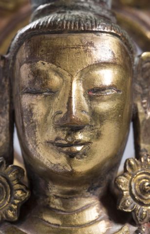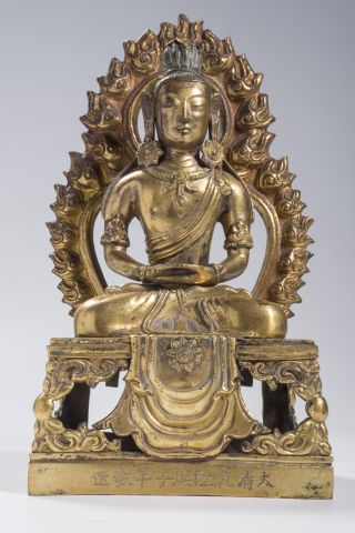 Sujet en bronze doré représentant le Bouddha Amitayus assis en dhyanasana sur une base quadrangulaire devant laquelle retombe un drapé, les mains réunies en dhyanamudra, tenant initialement le vase à eau lustrale. La divinité, coiffée d’un haut chignon, est adossée à une mandorle flammée. A l’avant du socle, est gravée l’inscription, datée 1780, Da Qing Qianlong Gengzi Nian Jingzao. Chine, XVIIIe siècle. Haut. 21,5 cm. (Manque le vase)
