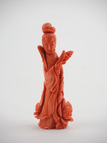 Sujet en corail 'jeune fille présentant un branchage fleuri'. H. 16 cm. Chine avant 1940