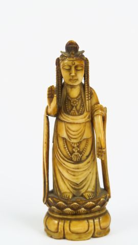 Sujet en ivoire "Divinité aux yeux clos". Japon, vers 1900 H. 11,2 cm Vente aux enchères conforme aux dernières instructions (17/11/2017) du Ministère transmises par le Conseil des Ventes.