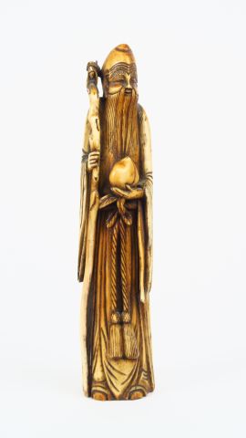 Sujet en ivoire figurant le sage de la longévité tenant un bâton dans la main droite et une pêche dans la main gauche, belle patine jaune. Chine, époque Qing, XIX ème siècle. H. 18 cm Poids : 251 g Nom scientifique de l’ivoire : ivoire d’éléphant Elephantidae spp (I/A, pré-convention), spécimen antérieur au 1er juin 1947 et conforme à la réglementation CE 338/97 du 09/12/1996, art. 2-W mc. Pour une sortie de L’UE, un CITES de ré-export sera nécessaire, celui-ci étant à la charge de l’acquéreur.
