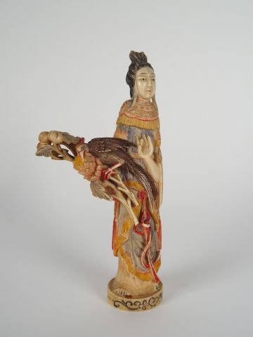 Sujet en ivoire polychrome représentant une femme au bouquet de pivoines et au phénix. Japon, vers 1920. H. 16 cm