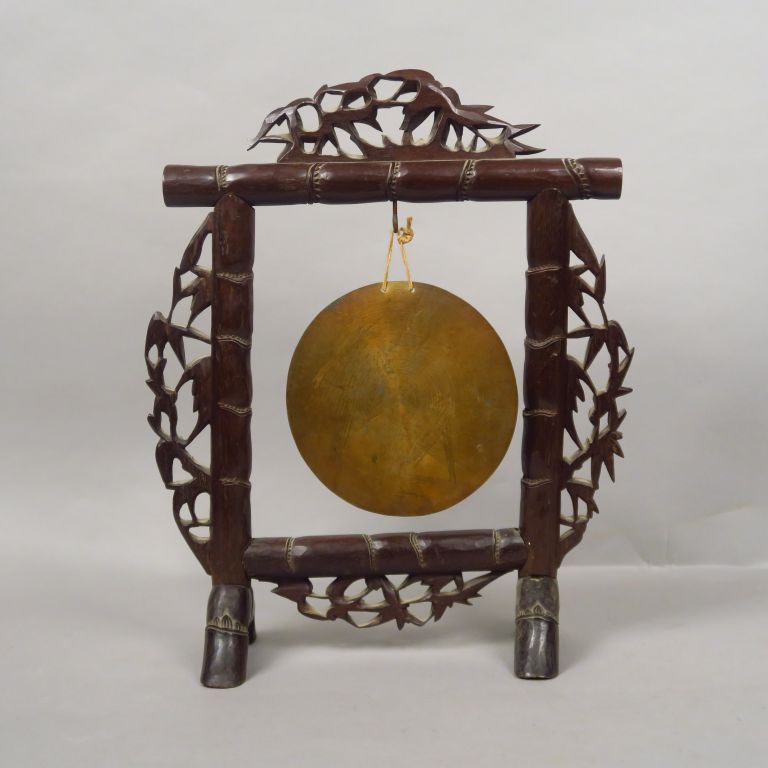 Support de gong en forme de portique, en bois sculpté à l’imitation du bambou, portant un gong en alliage de cuivre. Vietnam, vers 1900. Dim. totale : 36 x 27 cm (petits manques)