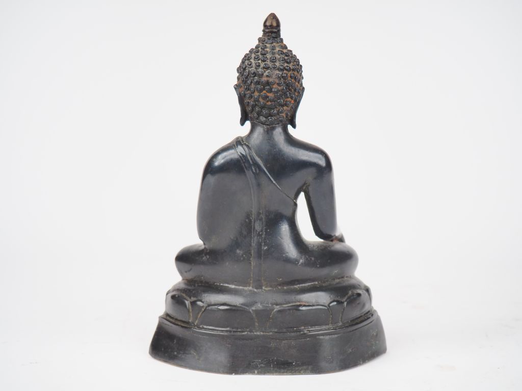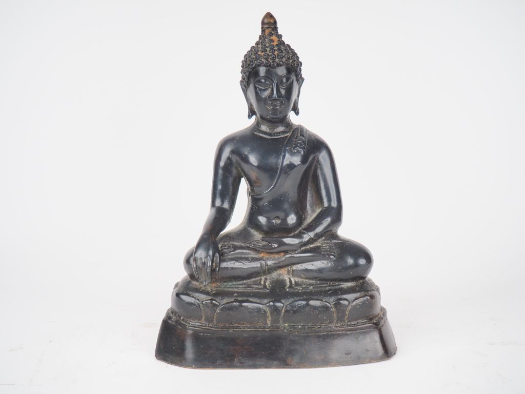 Thailande, XXe siècle, Statuette en bronze de patine brune représentant un bouddha faisant le geste de la prise de la terre à témoin. H. 22 cm