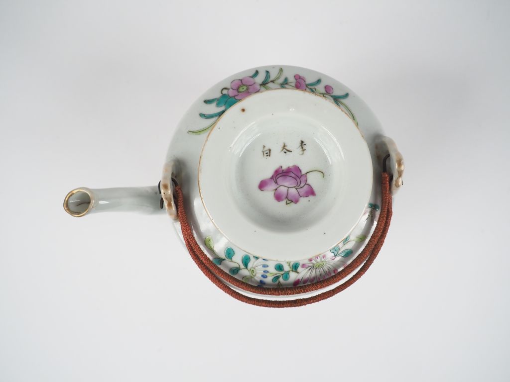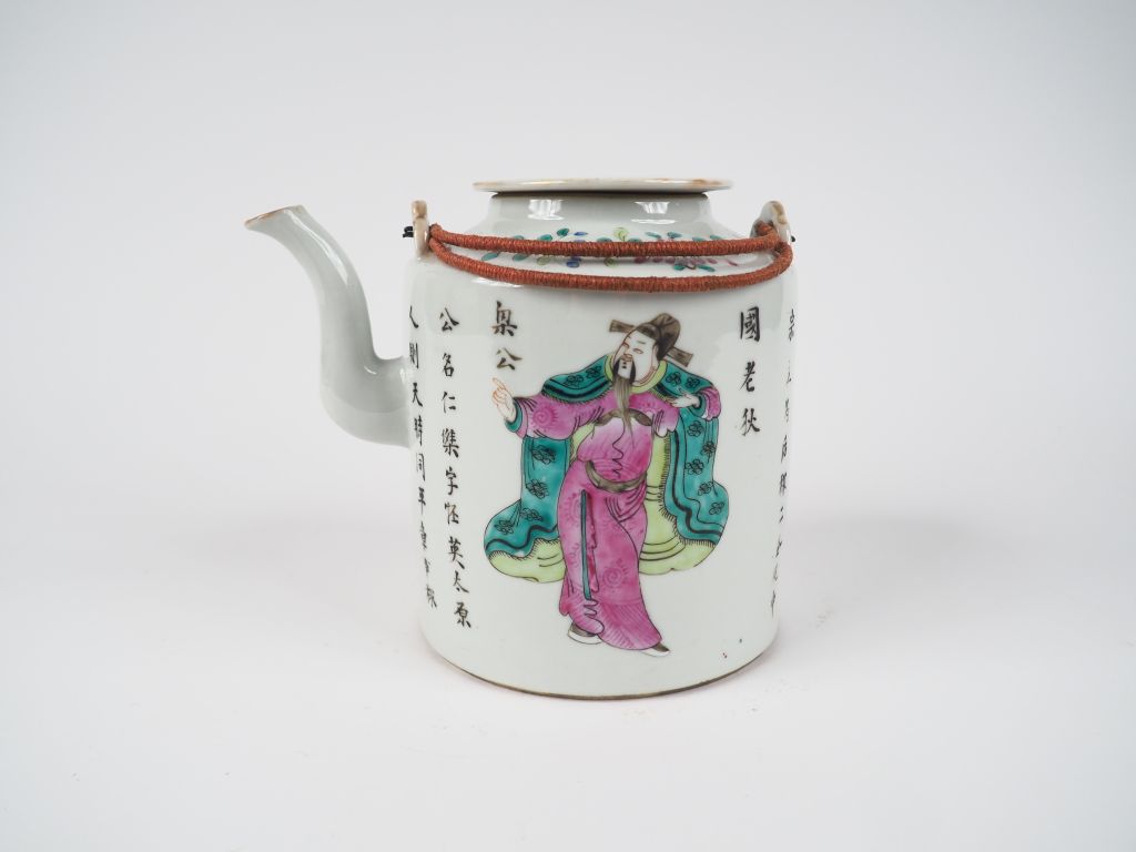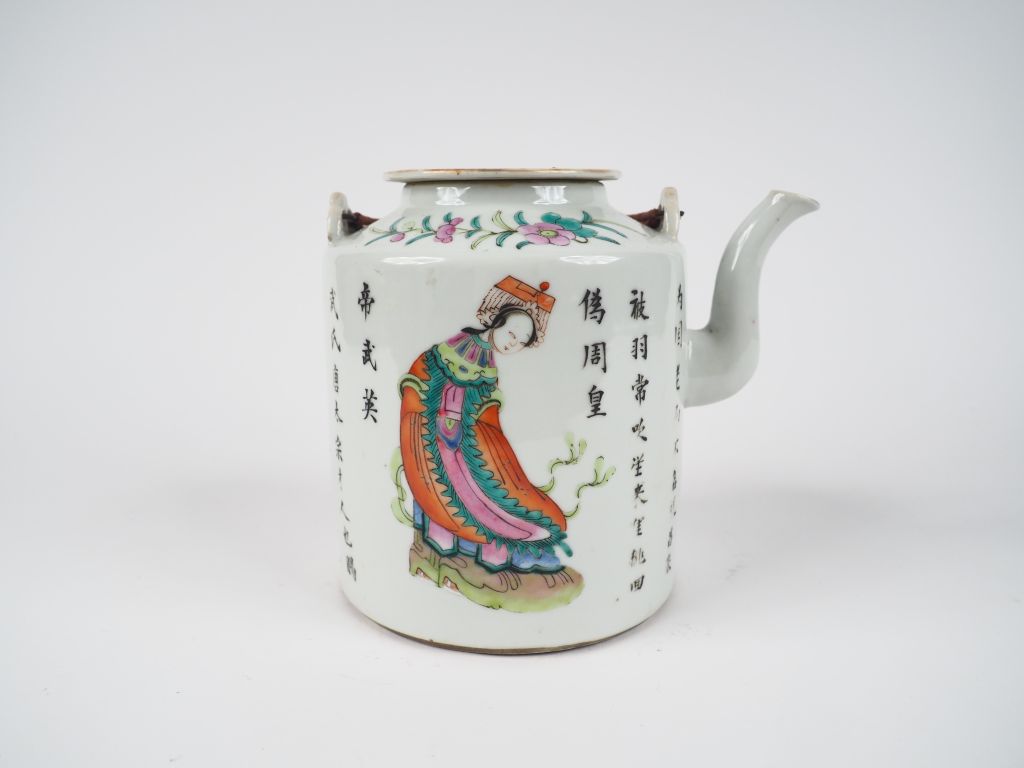 Théière en porcelaine et émaux de la famille rose, à décor de diginitaires , dans un panier H. 16 cm (accident)