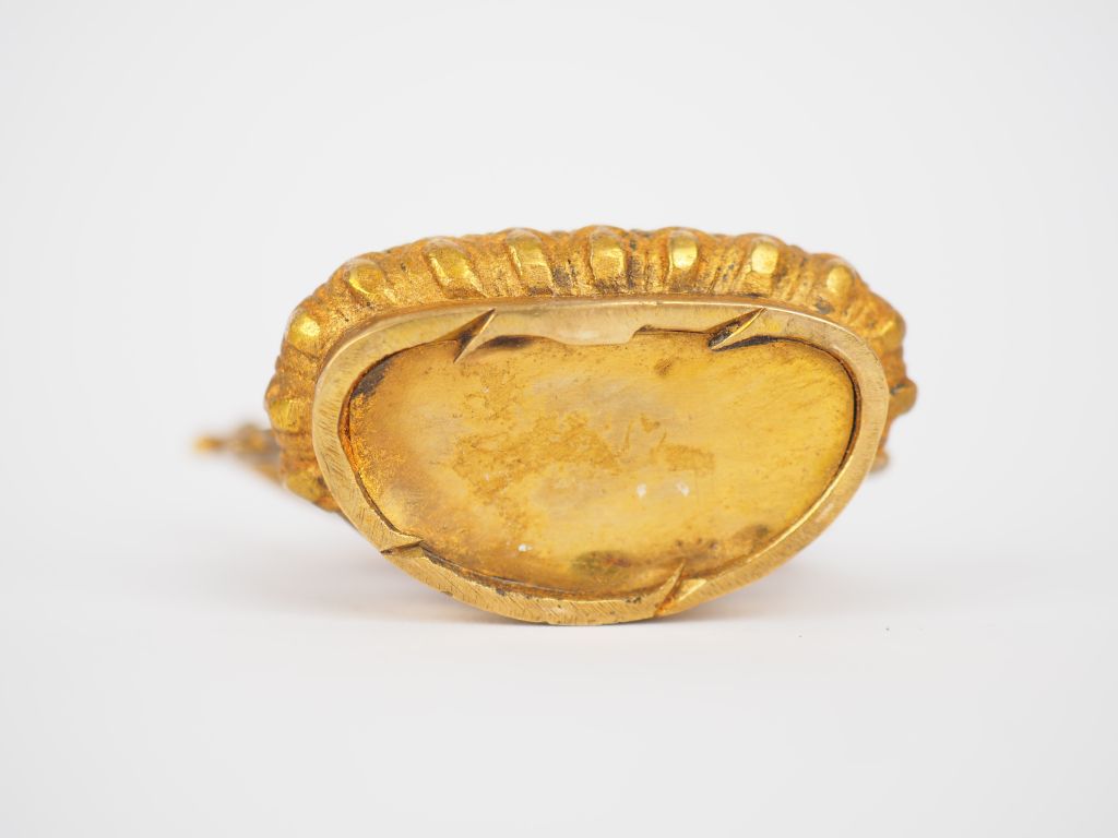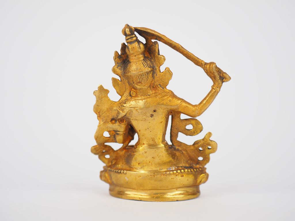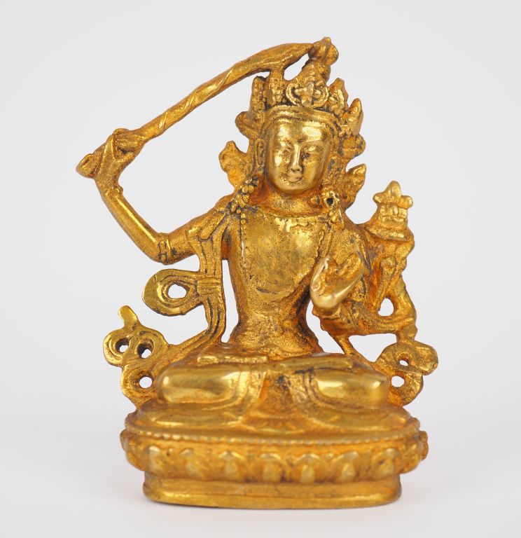 Tibet, XXe siècle, Statuette en bronze doré représentant Manjusri assis sur un lotus et tenant un sabre. H. 8,1 cm.