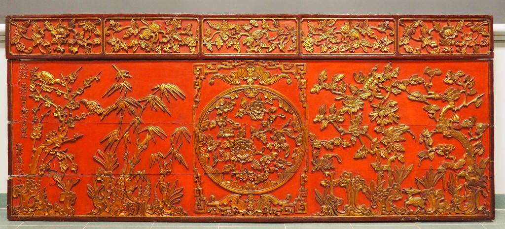 Travail de Ningbo - Chine fin XIXe siècle, Grand panneau en bois laqué rouge et décor sculpté en relief à la feuille d'or, décor de papillons, de chauve souris, pins de longévité, de pivoiniers, de prunus, de bambou , symbolisant les trois amis de l'hiver. Dim. 224 x 96 cm. (fentes)