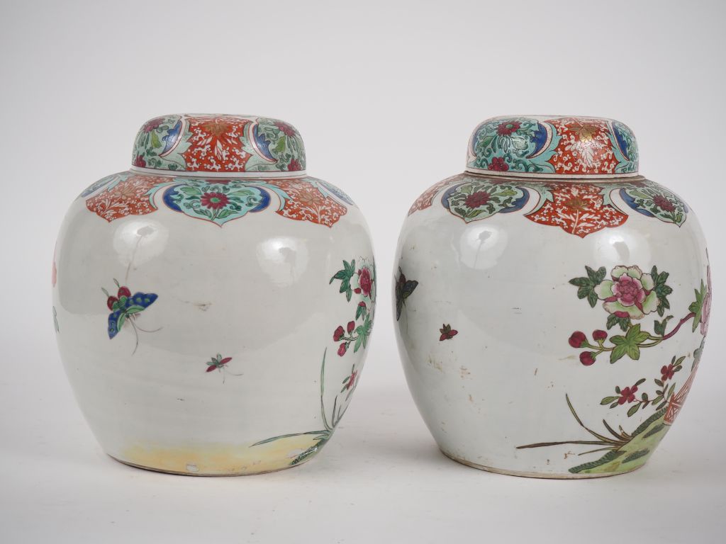 Travail européen, dans le goût chinois Paire de pots à gingembre en porcelaine et émaux de style famille rose, à décor de terrasses arborées, pivoines en fleurs, papillons et guirlandes de ruyi. H. 25,5 cm (Petites égrenures au couvercle de l’un, saut d'émail)