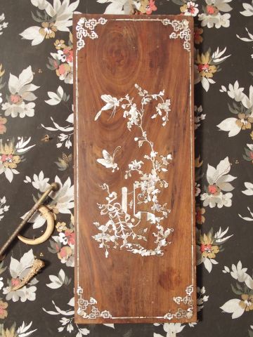 Trois panneaux (petit modèle) en marqueterie de nacre et bois exotique, décor de papillons et de végétaux. Indochine. XIXème