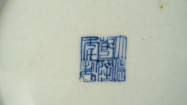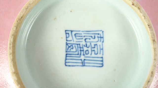 Trois pièces en porcelaine à décor stylisé rouge sur fond rose, porte une marque apocryphe. Chine, XIX ème siècle. Diam. 18,5 à 20 cm