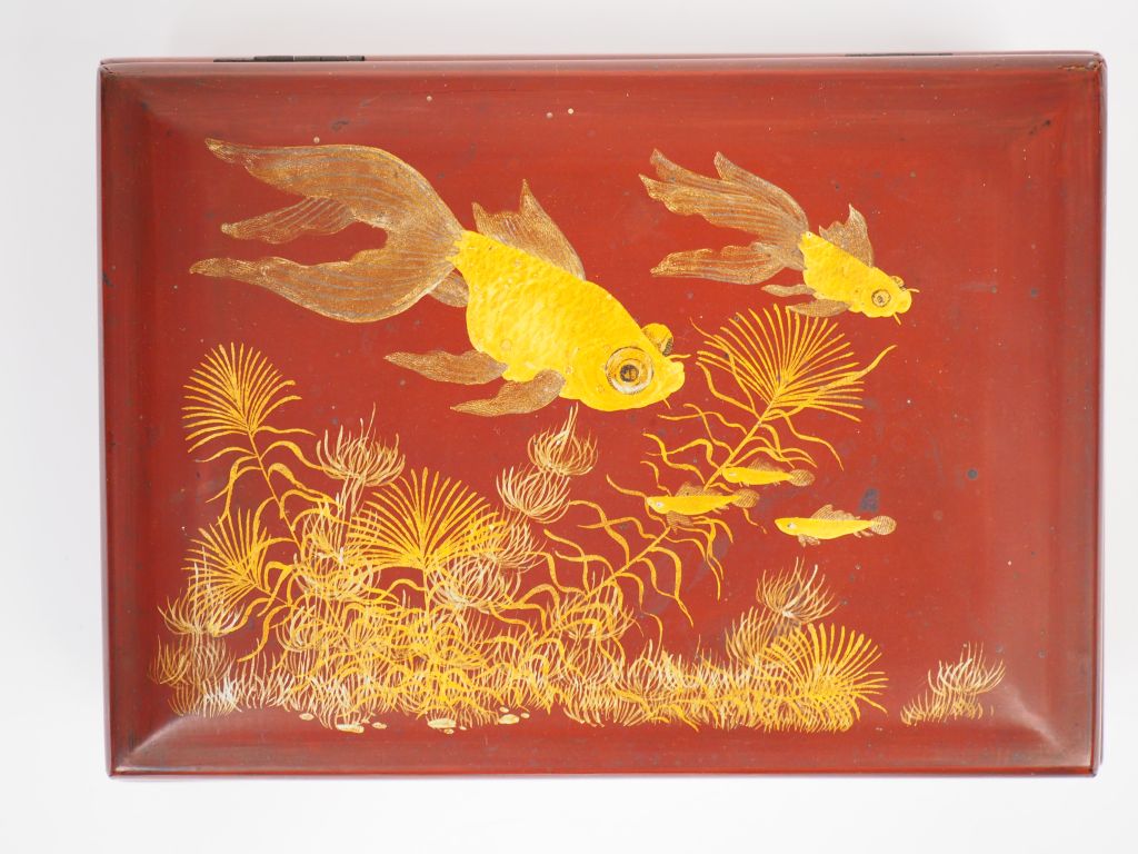 TRUONG VAN THANH Coffret en laque rouge, à décor rehaussé d'or de poissons voiles parmi des plantes aquatiques. Signé. Vietnam. 19 x 11,5 cm