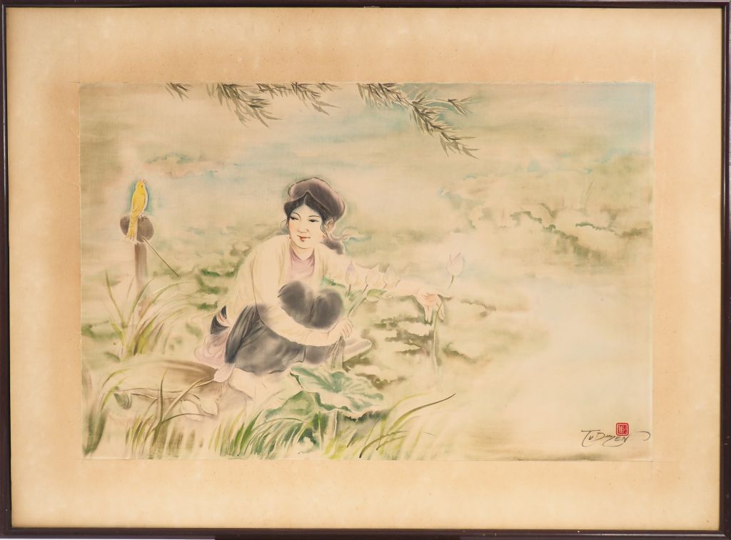 TU DUYEN "Jeune fille cueillant des lotus et écoutant le chant d'un oiseau". Aquarelle sur soie, signée en bas à droite. Dim. 48,5 x 73,5 cm