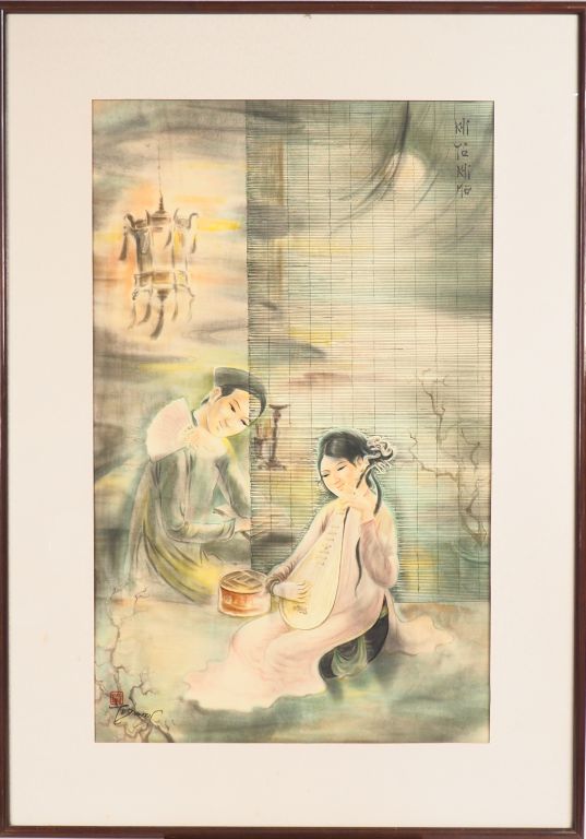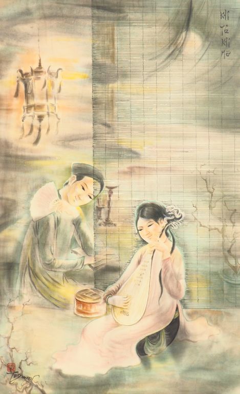 TU DUYEN "la leçon de musique à la lanterne" Encre et couleur sur soie, signée en bas à gauche Dim. 78,5 x 48,5 cm