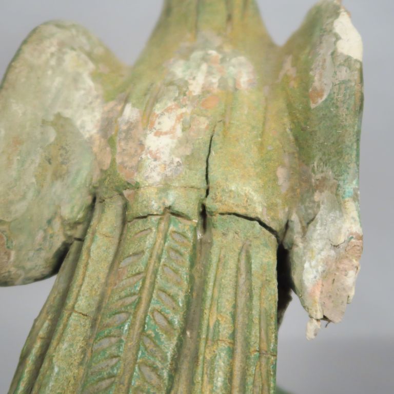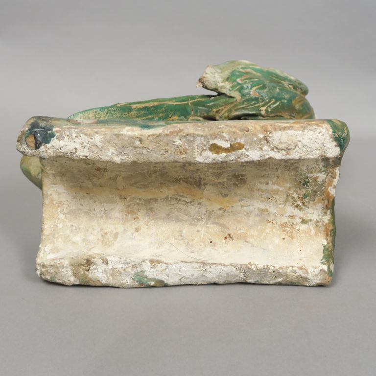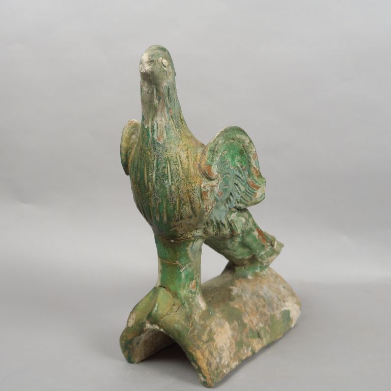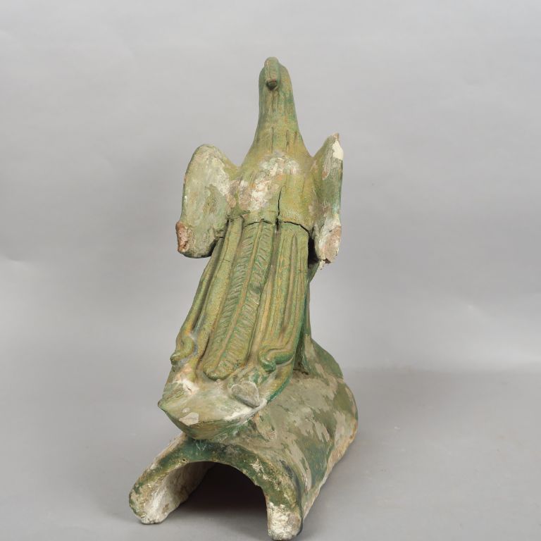 Tuile faitière en céramique émaillée vert, représentant un phénix. Chine, fin de la période Ming, XVIIème siècle (Restaurations) H. 29 cm