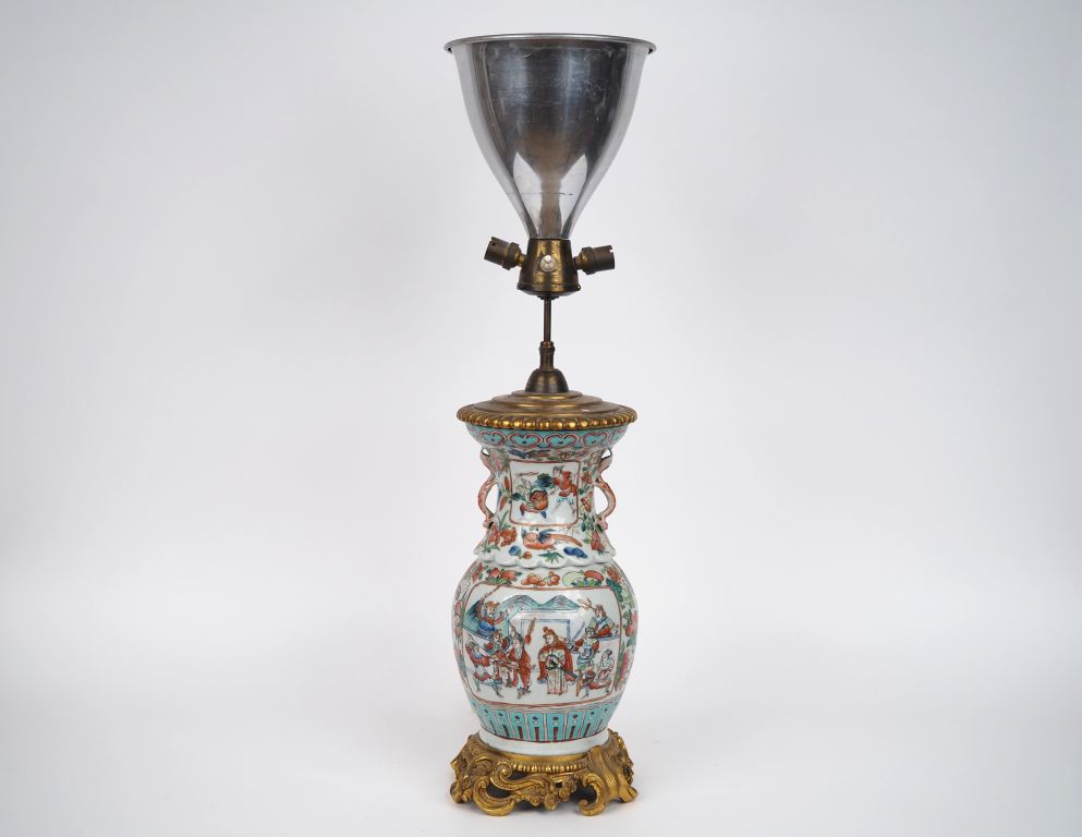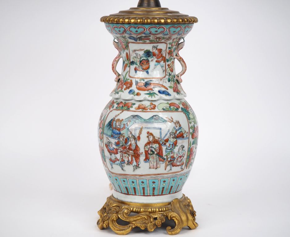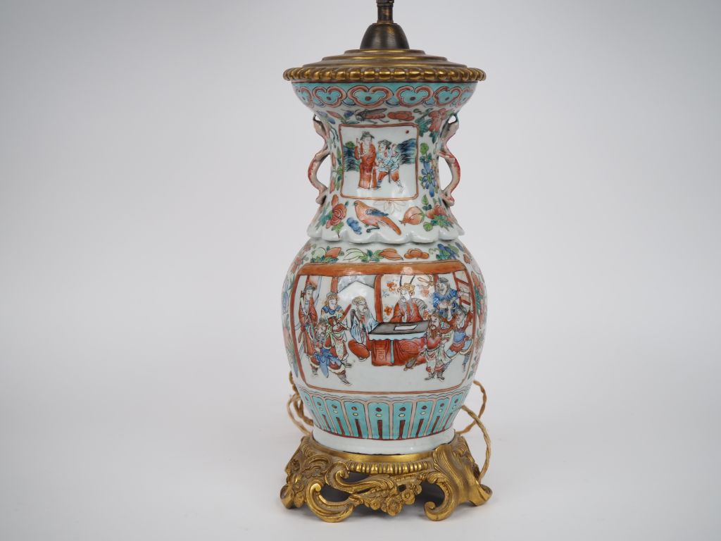 Vase balustre à col renflé en corolle, en porcelaine et émaux de la famille rose à décor de scènes de théâtre et d'un jugement, oiseaux, fleur et végétaux complètent l'ornementation. Monté en lampe. H. 39 cm