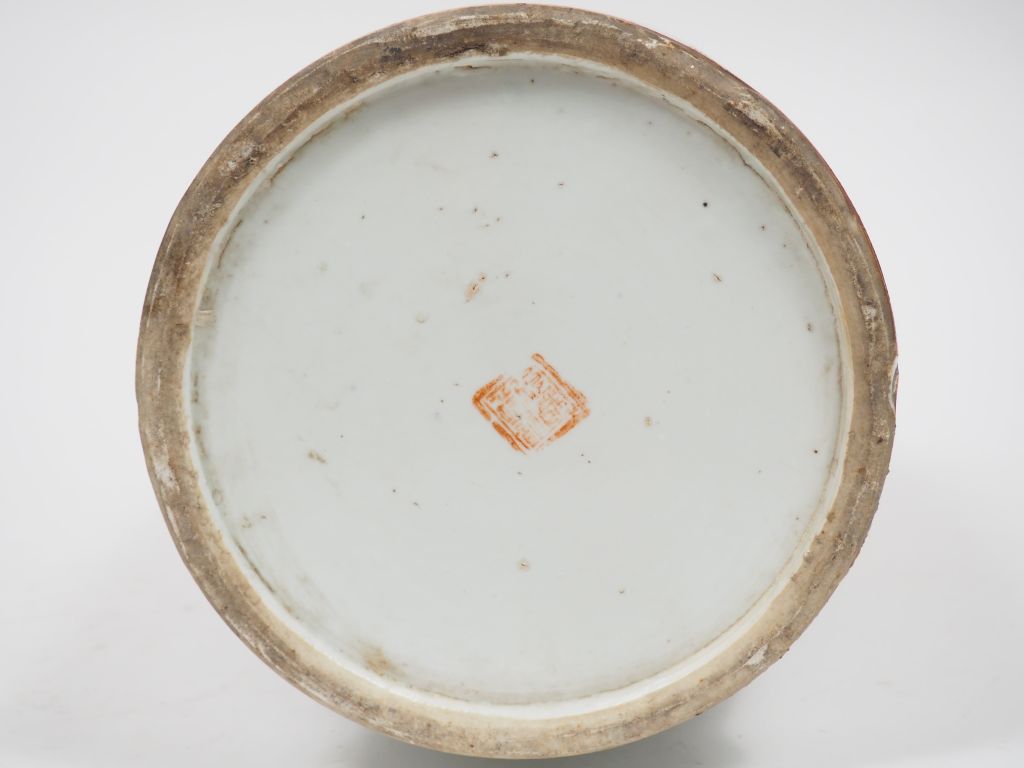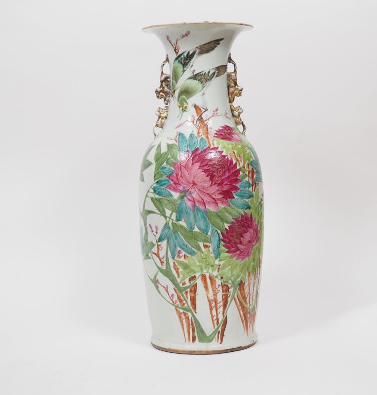 Vase balustre en porcelaine de style famille rose, à décor de pivoines éclatées. Le col orné de lions bouddhiques en relief. Poème calligraphié au revers. Chine, vers 1920, période République. H. 60 cm (éclat sur la base, petits éclats au col).