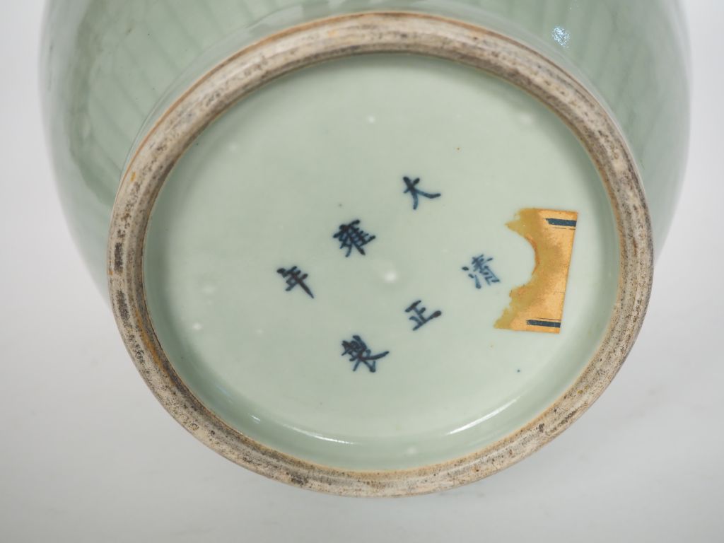 Vase balustre en porcelaine émaillée céladon à décor moulé sous couverte de fleurs de lotus et tiges feuillagées. Fêlé au col. H. 39 cm