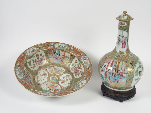 Vase bouteille couvert et son bassin, en porcelaine de Canton polychrome, à décor dans des réserves alternées, de personnages de cour, et d'oiseaux, papillons et fleurs , sur fond de rinceaux rehaussés d’or. Chine, Canton, fin XIXe siècle. (restauration, bassin agrafé). H. 40 cm diam. 40,5 cm
