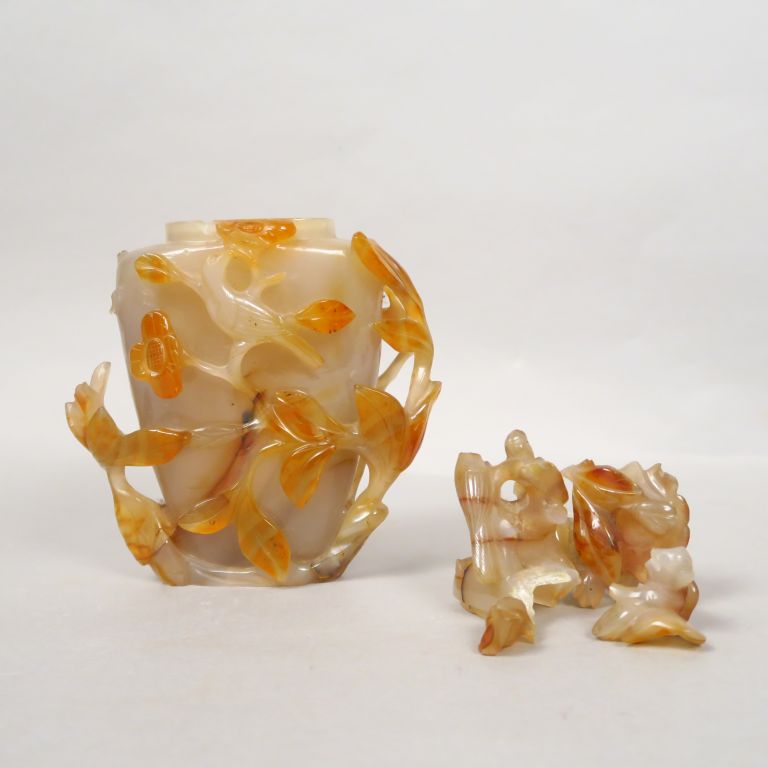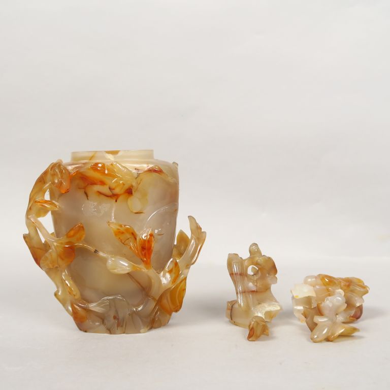 Vase couvert en agate cornaline sculpté d’oiseaux sur des arbustes en fleurs. Chine, vers 1920 H. 25 cm (accidents au couvercle)
