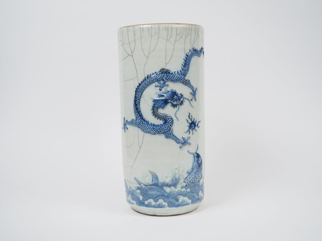 Vase cylindrique en porcelaine et émail céladon craquelé, finement décoré en léger relief d'un dragon poursuivant le joyau sacré, d'une carpe émergeant des flots écumants et d'une chauve-souris. Chine, XIXème siècle. H. 37 cm