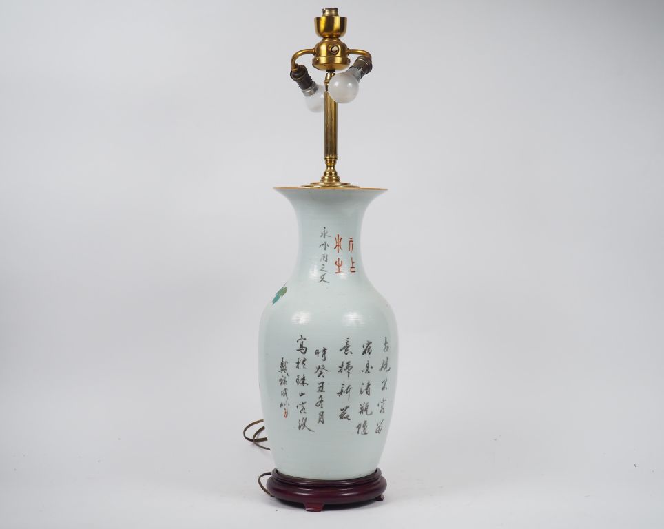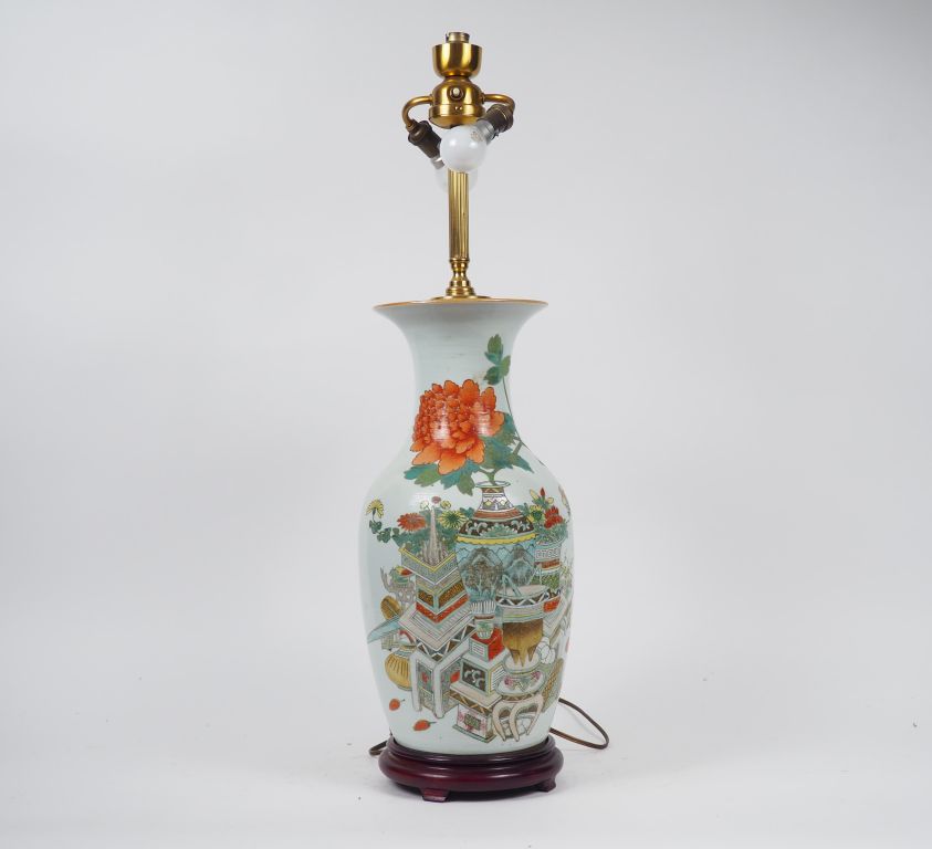 Vase de forme balsutre en porcelaine et émaux polychromes, à décor de vases et objets mobiliers. Chine, vers 1920. H. 44,5 cm (percé pour être monté en lampe)