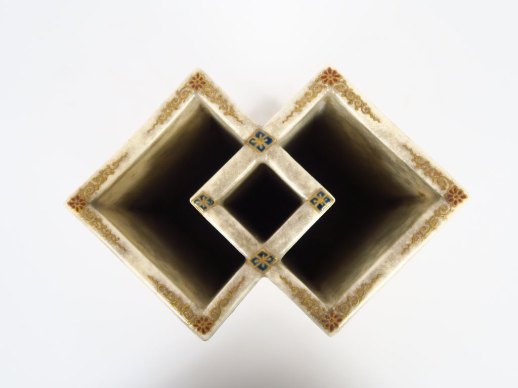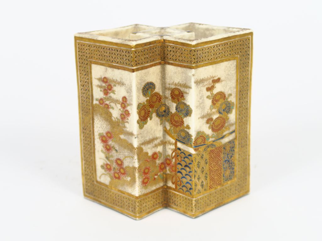 Vase double en céramique Satsumé Yaki Bijustsu. Kinryuen, à décor de passementeries, de fleurs de chrysanthèmes, de pivoines et de motifs stylisés, pourtour orné d'une guirlande de mille fleurs. Signé H. 16 cm