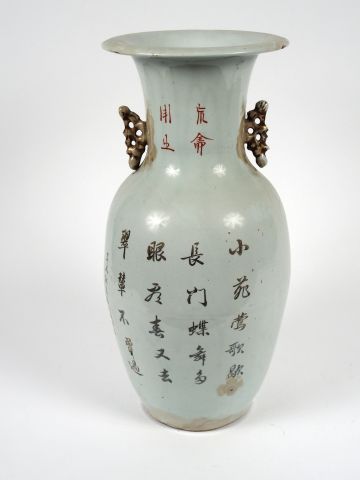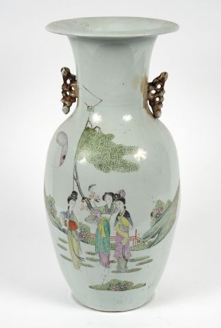 Vase en porcelaine à décor de jeunes femmes dans un jardin sur une face et d'écriture sur l'autre, les anses ajourées. Chine, vers 1900. H. 44 cm (égrenures au col)