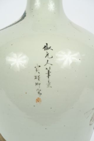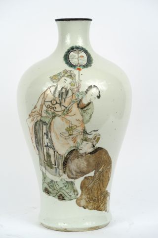 Vase Meiping en porcelaine à décor de personnages faisant une offrande à un dignitaire sur fond blanc, sommet du col avec une base en métal. Signé Jia Xing Qing (Guangxu). Chine, XIX ème siècle. H. 39 cm (Petit rodage au col)