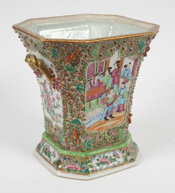 Vase octogonal évasé en porcelaine de Canton à décor de personnages dans des réserves et de branchages fleuris en relief sur fond doré. H. 21,5 cm (manque le couvercle)