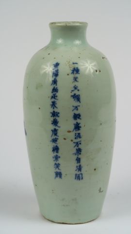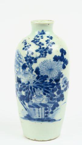 Vase ovoïde en porcelaine de Huê à décor blanc bleu de fleurs et branches de pivoines, poème sur les fleurs de chrysanthème. Chine, dynastie Qing, XIX ème siècle. H. 23 cm