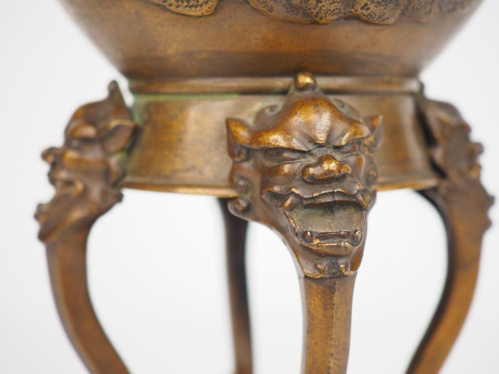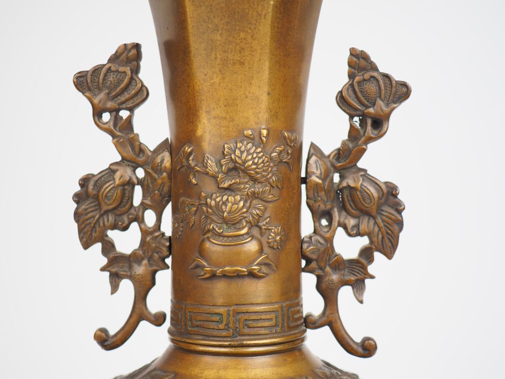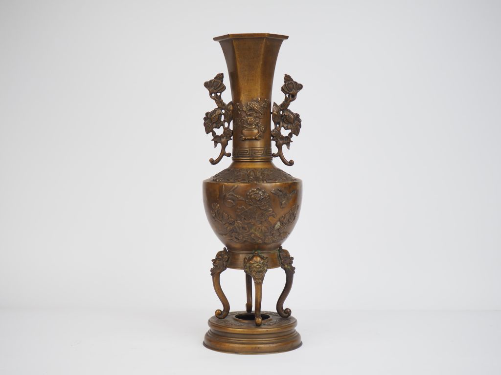 Vase pansu à col de forme hexagonale en bronze de patine claire, à décor de kirin et compositions florales. Japon, période Meiji. H. 45 cm
