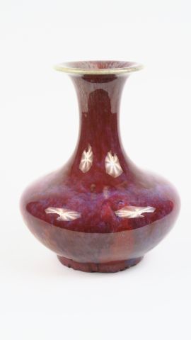 Vase pansu à col évasé en grès porcelaineux émaillé sang de boeuf et flammé bleu. Chine, XIX ème siècle. H. 24 cm