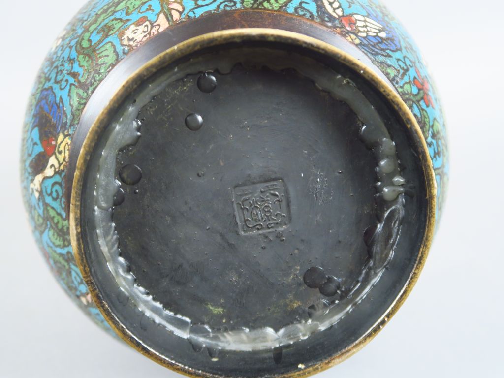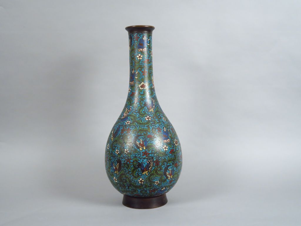 Vase pansu à long col en bronze, décor en émaux champlevés polychromes, à décor de personnages et de phoénix évoluant parmi des fleurs et rinceaux feuillagés. Japon, vers 1900. H. 52,5 cm