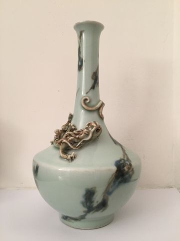 Vase pansu à long col en porcelaine et émail céladon, à décor de nuages stylisé, un dragon en relief complétant le décor. Marque d’atelier sur la base. Chine, XXème siècle. H. 24,5 cm (Petits éclats)